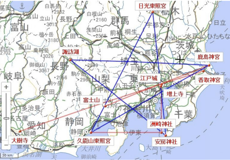 មិនត្រឹមតែទ្រង់ទ្រាយទីក្រុងប៉ុណ្ណោះទេ Edo ថែមទាំងត្រូវបានគ្របដណ្តប់ដោយផ្កាយដ៏ធំមួយ – ជានិមិត្តរូបនៃការបង្ក្រាបអំពើអាក្រក់ គេអាចមើលឃើញថា ផ្កាយត្រូវបានបង្កើតឡើងដោយការតភ្ជាប់ទីតាំងប្រាសាទ ទីសក្ការៈ និងបឹងពិសិដ្ឋ។