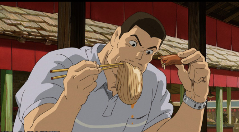 ក្នុងរឿងនេះ ឪពុកម្តាយរបស់ Chihiro (តួអង្គឯកក្នុងរឿង) នៅពេលដែលវង្វេងក្នុងទីក្រុងដែលគេបោះបង់ចោល ពួកគេធុំក្លិនអាហារដ៏ឈ្ងុយឆ្ងាញ់ភាយចេញពីហាងមួយ។ ទោះបីជាមិនឃើញម្ចាស់ហាងក៏ដោយ ឪពុកម្តាយរបស់ Chihiro នៅតែសម្រេចចិត្តអង្គុយចុះបរិភោគអាហារនោះ ហើយបន្ទាប់មកបានប្រែក្លាយទៅជាជ្រូក។